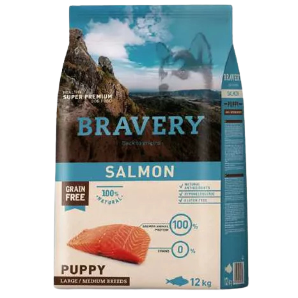 Bravery Salmon Puppy Large/Medium Breeds es un alimento para cachorros de razas medianas y grandes. Libres de grano y cereales, los alimentos Bravery son proteicos, con carne siempre como primer ingrediente y enriquecidos con antioxidantes, hipo alergénicos y 100% naturales. Receta de alto valor biológico cuyo aceite es rico en ácidos grasos ω-3, especialmente EPA y DHA.