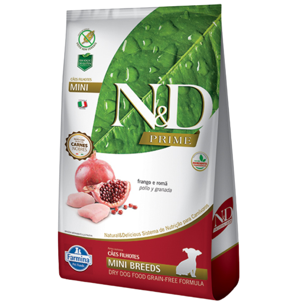 N&D Grain Free Puppy Mini Breeds-Pollo y Granada es un alimento libre de grano indicado para cachorros de raza pequeña y para hembras en el tercio final de la gestación y lactancia. Formulado con proteína de pollo de alta calidad. Con un óptimo equilibrio de minerales. Enriquecido con frutas, legumbres y Esencias Botánicas como Té Verde, Alfalfa, Aloe Vera y Psyllium.